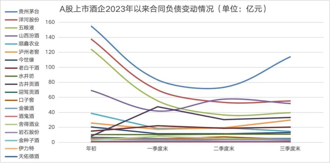 随着库存趋势向好,渠道信心在这一过程中也有所变化。中新经纬梳理Wind数据发现,2023年以来,单就合同负债而言,A股20家白酒企业普遍经历了先降后增的过程,5家酒企的合同负债余额出现了连续两个报告期下滑,其中贵州茅台、洋河股份、五粮液、今世缘环比降幅较大。