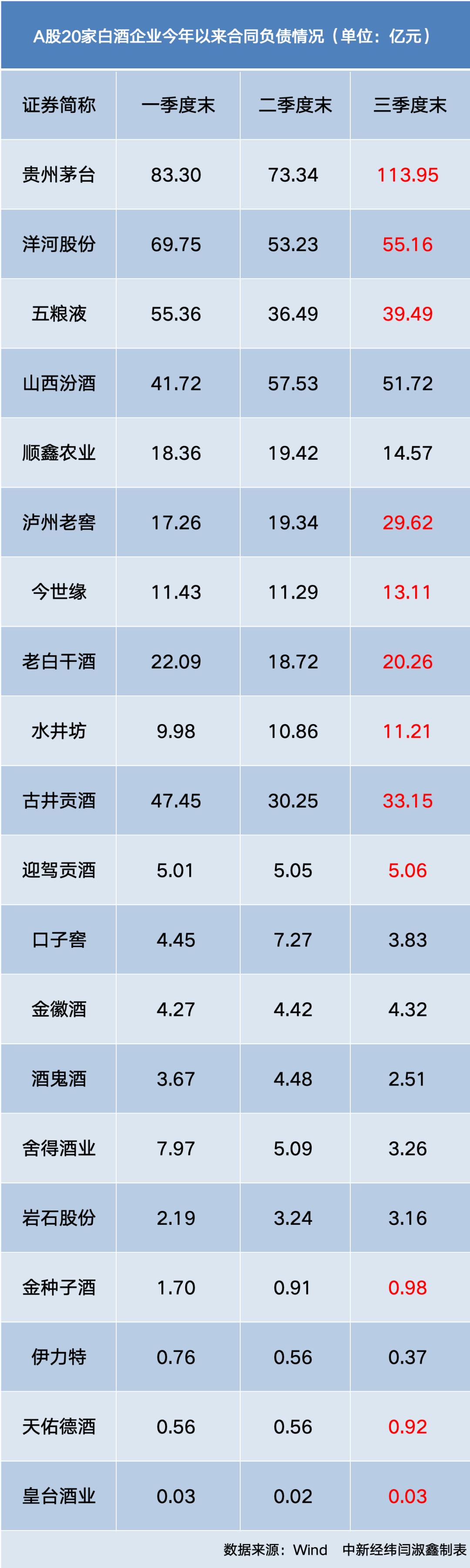 ▲A股20家白酒企业今年以来合同负债变动情况。数据来源:Wind 中新经纬闫淑鑫制图