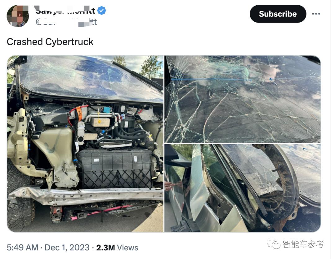 “战损版赛博皮卡“看起来应该是经过了撞击测试,可以明显看到车头损坏比较严重,挡风玻璃也出现了裂痕,但侧车身相对损坏较轻。