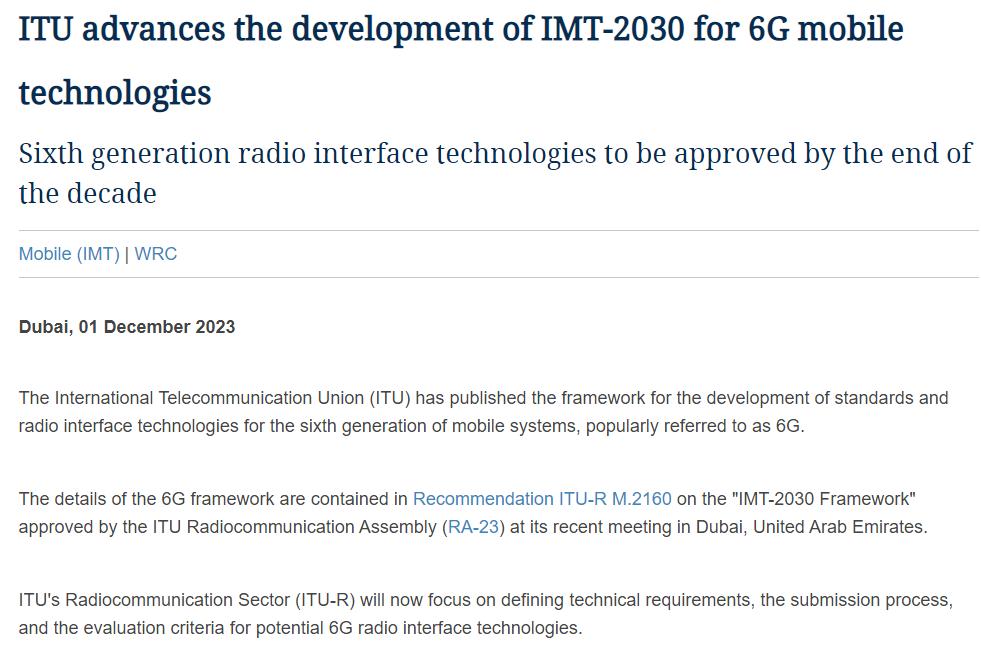 ITU-R的建议书代表了研发和实施全球公认的6G移动通信系统标准的重大进展。此前每一代移动通信系统,包括模拟蜂窝(1G)、数字蜂窝(2G)、IMT-2000(3G)、IMT-Advanced(4G)和IMT-2020(5G)也都是通过ITU实现了标准化的。