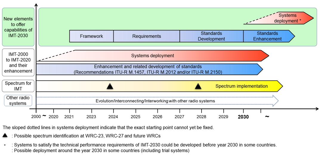 ITU提到,在规划IMT-2030的开发过程中,除了不断增强现有的IMT系统外,重要的是要考虑与其实现相关的时间表,这取决于用户趋势、需求、技术发展、标准的制定和改进、频谱问题、监管、系统部署等因素。这些因素是相互关联的,ITU计划最迟在2030年完成IMT-2030的初步标准化进程,以支持ITU成员从2030年起能够部署6G。