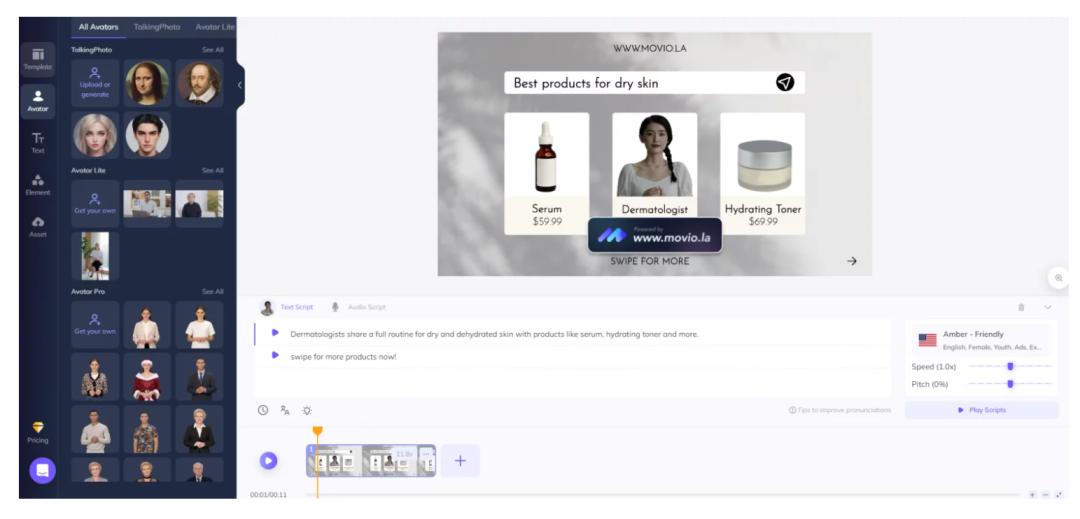 用户可以上传自己的照片,进行个性化形象定制,也可以在HeyGen提供的数字人素材和模板中选择,输入脚本后就能生成自己所需的多语种视频了。