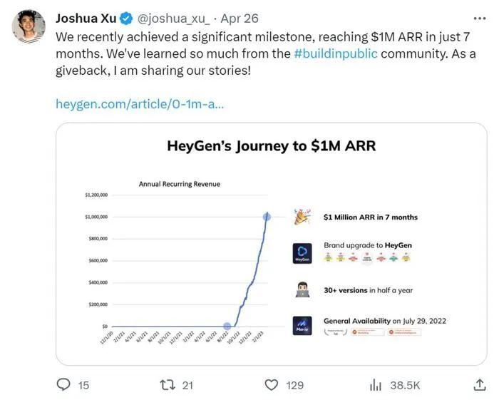 对此,有人认为,HeyGen是在“闷声发大财”。虽然猎奇玩家散去了,但留下来的用户还是给HeyGen贡献了收入增长,HeyGen连续九个月环比增长率在50%以上。创始人Joshua Xu也在社交媒体上公布了相关数据,仅七个月时间,ARR年度经常性收入就达到了100万美元。