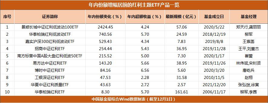 其中,红利主题ETF产品份额增幅尤为明显,如景顺长城中证红利低波动100ETF近期份额频频创下新高,11月30日最新份额达到32.42亿份,并以2424%的年内份额增幅位居第一;华泰柏瑞红利低波动ETF、嘉实沪深300红利低波动ETF分别以741%、529%的份额增幅排在二、三位。此外,招商中证红利ETF等多只产品年内份额也实现翻倍增长。