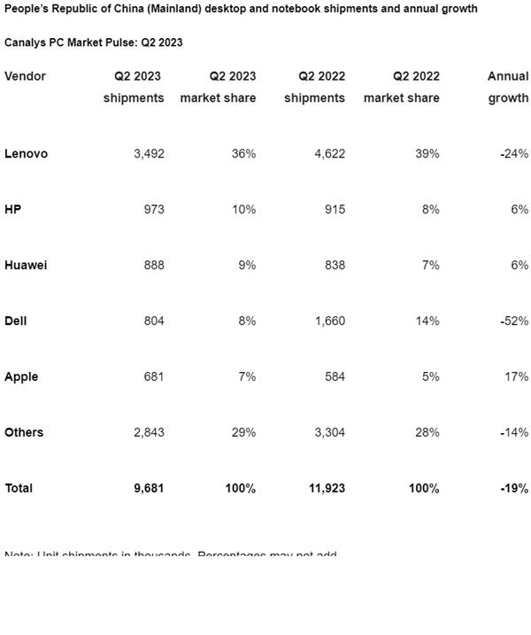 但是,从去年开始,戴尔的国内销量及市占率就已经开始走下坡路,而在Canalys的最新一份报告中,戴尔的市占率已经由曾经的第二一路滑落到第四,被惠普、华为所取代。