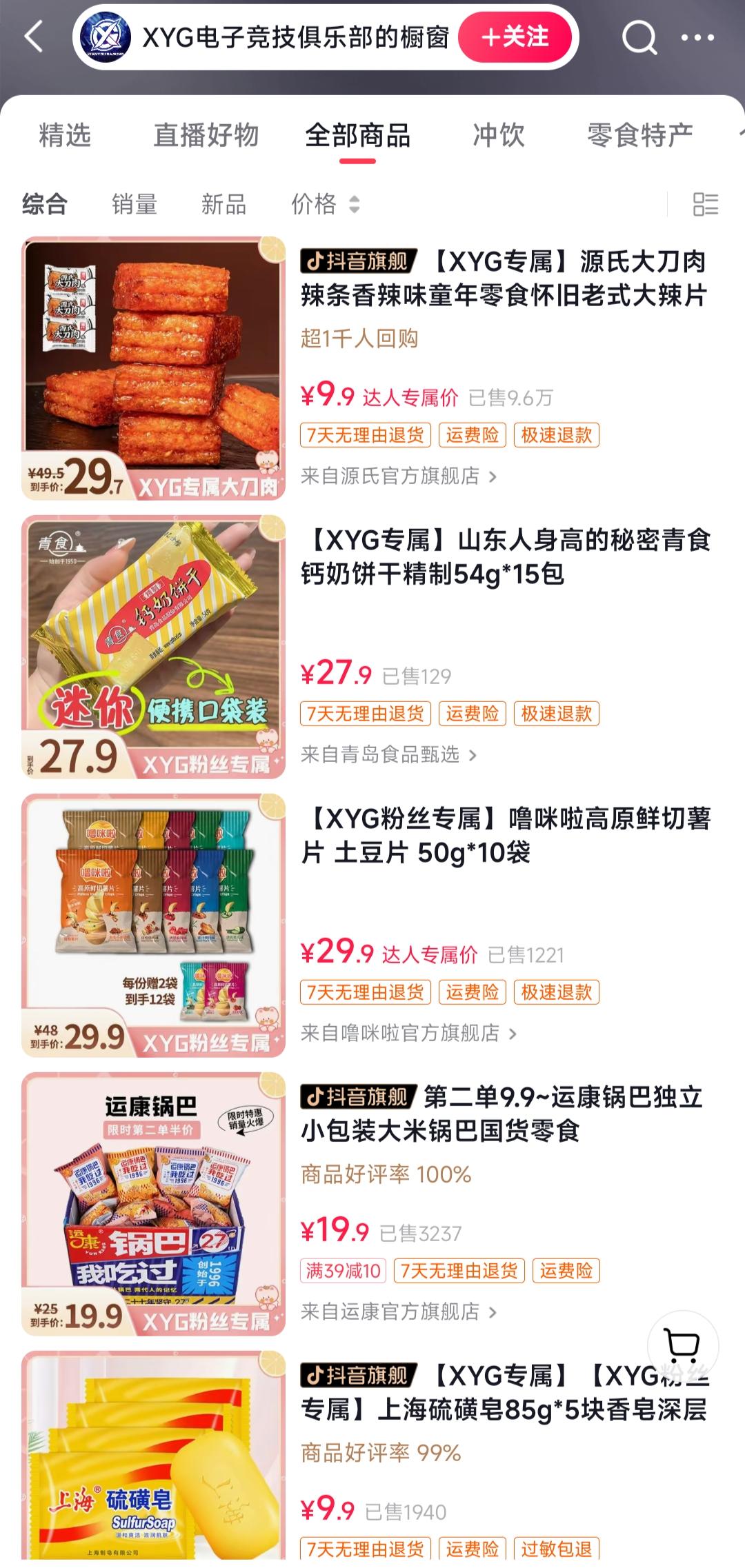 在XYG战队的抖音橱窗也挂上了吃胖大仙的“大刀肉”,以及上海硫磺皂、汇源果汁、白玉牙膏、卫龙辣条、钙奶饼干等一系列打着“XYG粉丝专属”的促销产品。11月27日起,XYG战队在抖音直播为张大仙首播预热的同时,开始进行国货带货的先行尝试。