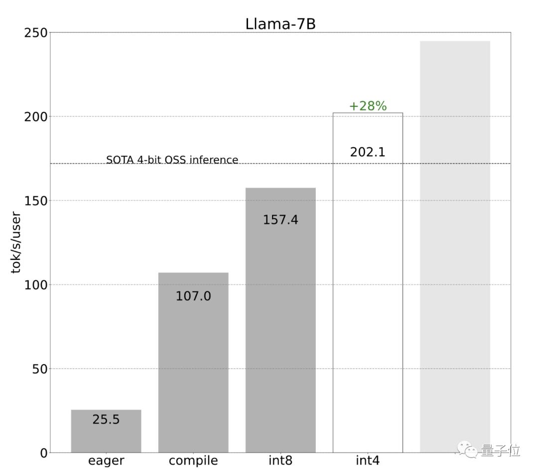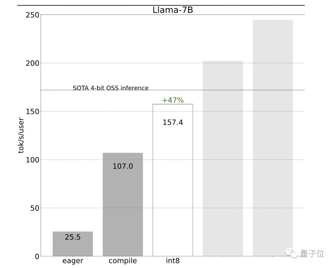 采用int8权重量化减少了内存负载,进一步提升了性能(157.4 tok/s):