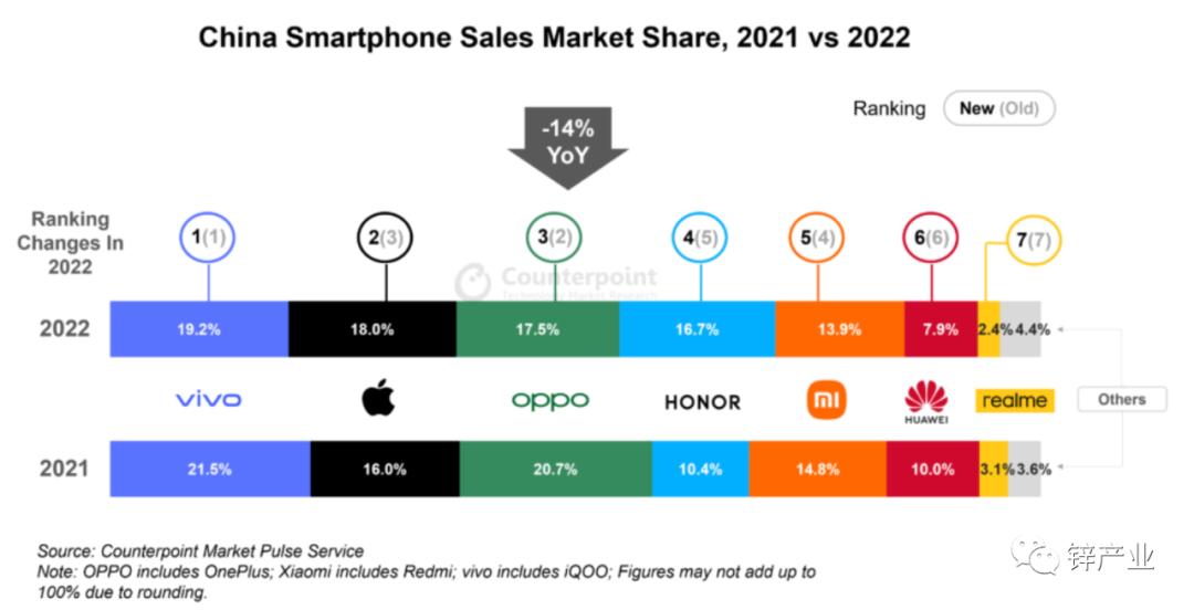 2022年的国内手机市场,苹果、小米、OPPO、vivo、荣耀、华为六家手机厂商吃下了超90%的市场份额,已经形成了稳定的产业格局,也曾是手机顶流的魅族,只剩不到1%的市场份额。