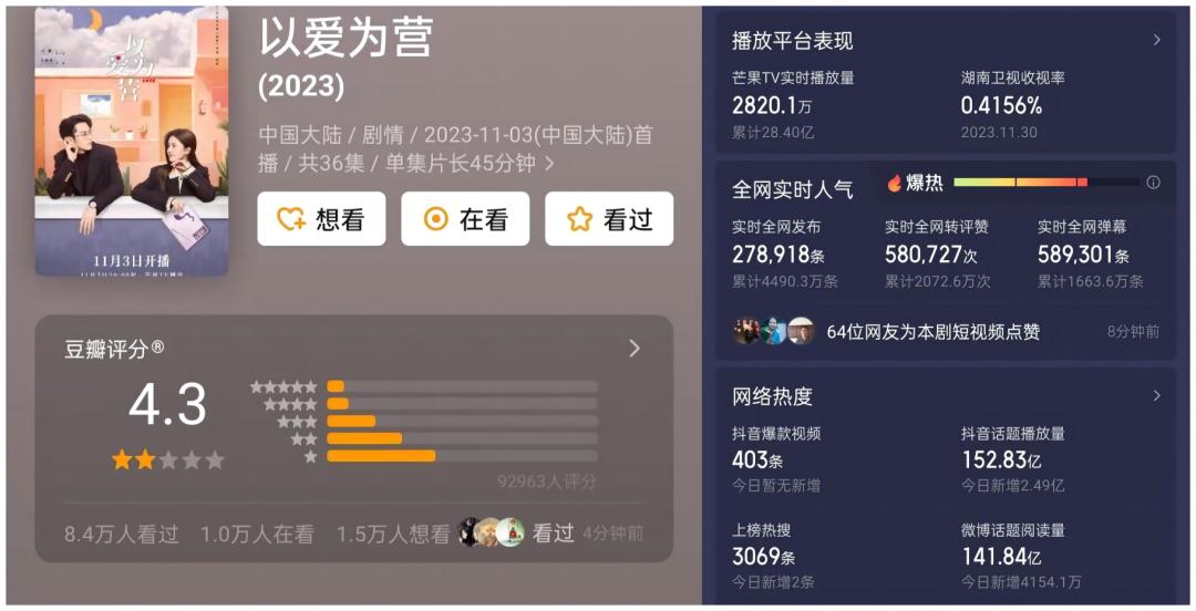 11月最火爆的两部剧,当属《宁安如梦》和《以爱为营》。《以爱》基本稳在市占率的TOP3,全网播放量破28.4亿。