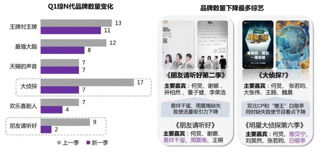 芒果TV老牌节目《歌手》《快本》告结,《向往的生活》《浪姐》《披哥》等“综N代”的豆瓣评分一路下跌,广告吸金能力也同步下滑,据艺恩智库《2022Q1综艺赞助市场研究》,《大侦探》品牌合作数从17个锐减到了7个,《朋友请听好》到第二季从9家削减到2家。