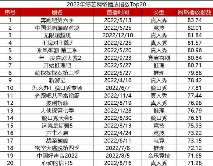 热度上,据Vlinkage2022年综艺网络播放指数TOP20,多平台播放的热门综艺有《无限超越班》等6个,腾讯有《开始推理吧》等6个,芒果有《浪3》《披哥2》《密逃4》等4个,爱奇艺独播有《中国说唱巅峰对决》等2个,优酷独播的只有《这!就是街舞》,芒果的优势日渐不显。