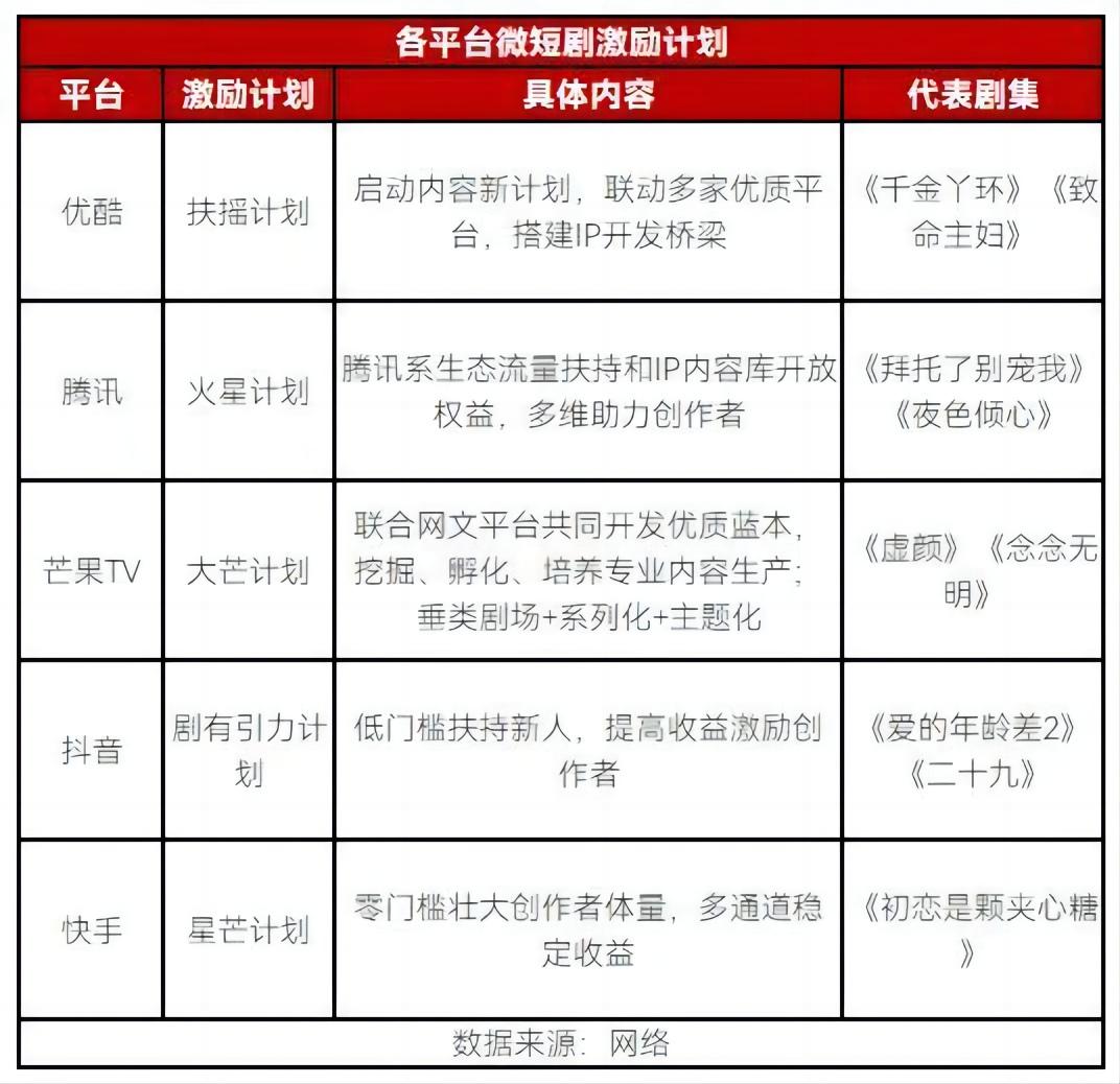 而在短剧赛道,腾讯2020年发布“火星计划”进行扶持;优酷2019开设小剧场频道,2021推出“扶摇计划”“好故事计划”;入场最迟的爱奇艺于2019年便发布剧情短视频分账模式,2022年底才发布“云腾计划”。
