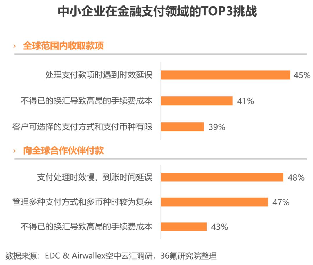 SaaS平台和线上交易平台填补了传统金融机构在服务中小企业上的空白,但实际应用中,尽管平台业务为迎合企业需求得以持续拓展,但毕竟“术业有专攻”,大而全的平台实际上并不存在,这也意味着中小企业在获取多项金融服务时往往需要依赖多家机构,系统和体系相对割裂,新的挑战也因此逐渐产生。仍旧以支付环节为例,彼此独立的支付体系削弱中小企业全球范围内资金流转效率,由此带来的收付款时效性、换汇成本以及多币种和多支付方式管理等成为制约中小企业营收能力的藩篱。