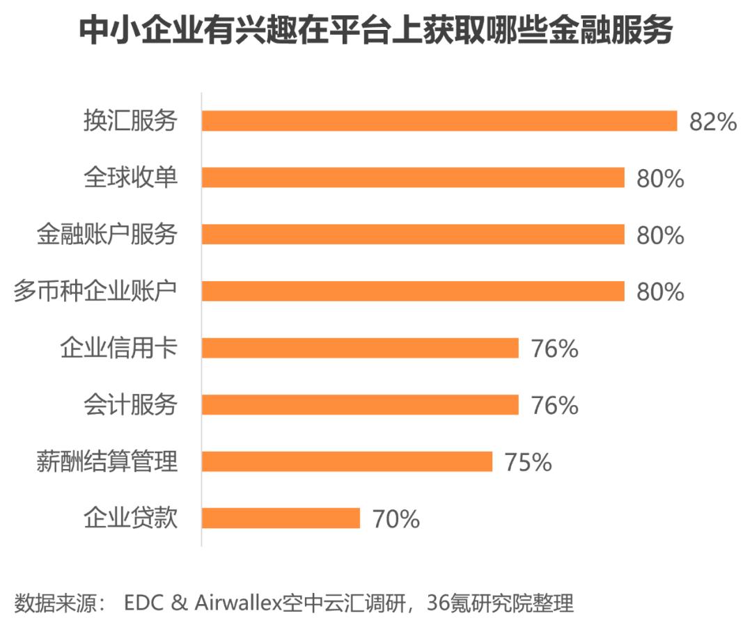这不是只有中资企业才会面临的困境,而是摆在全球中小企业面前的共同难题。与大型企业一样,它们也希望获得来自第三方的定制化和高效运作的金融服务,但实际上,第三方金融机构,特别是以银行为典型的传统机构,多围绕大型企业的核心诉求来设计金融产品,也更愿意为其提供配套服务。对金融机构而言,业务完善、经营稳健的大型企业意味着可观的营收和可控的风险,自然成为诸多金融机构的理想客群。金融市场上,人们更多看到银行对大型企业的“锦上添花”,而鲜见为中小企业的“雪中送炭”。2023年支付咨询公司Edgar,Dunn&Company(以下简称EDC)以及全球支付及金融平台Airwallex空中云汇在全球范围内对千家中小企业展开调研,其统计数据也恰好印证了上述观点:中小企业并不认为银行这类传统金融机构能够满足自身需要,以支付环节为例,仅有44%的受访企业表示银行服务相对符合预期,而在拥有更复杂支付场景的零售行业内,这一比例则跌落至13%。