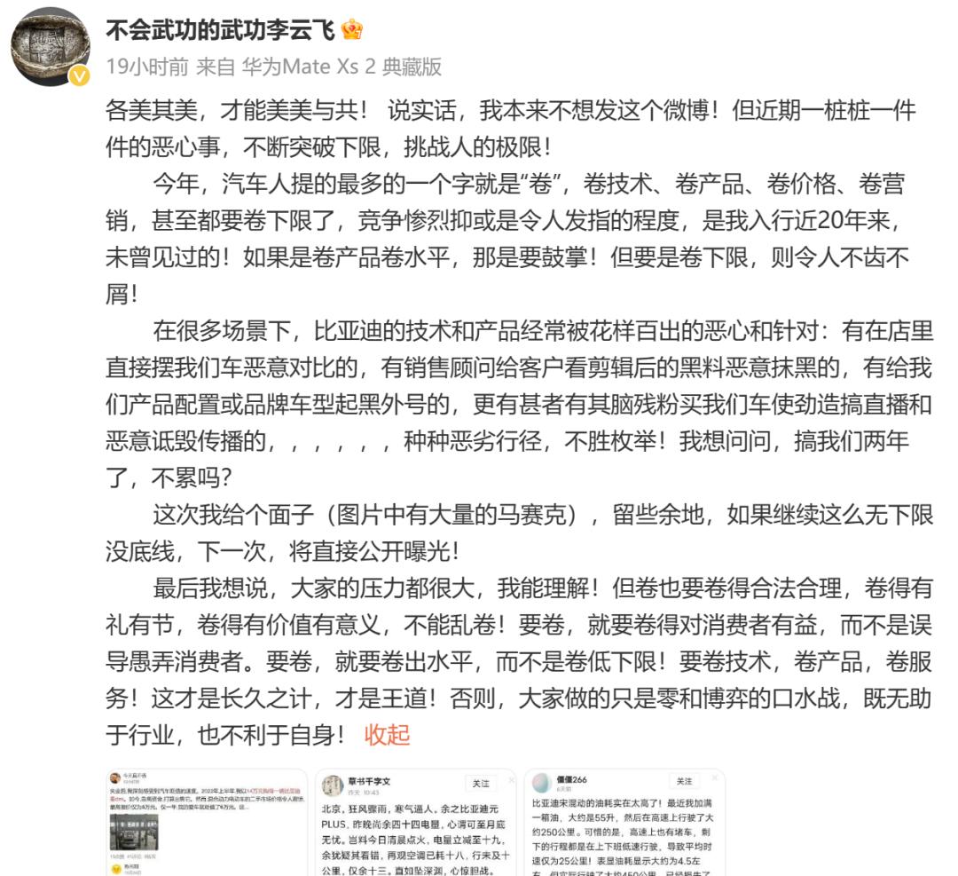 “今年,汽车人提的最多的一个字就是‘卷’,卷技术、卷产品、卷价格、卷营销,甚至都要卷下限了,竞争惨烈抑或是令人发指的程度。”12月3日,李云飞发微博称,在很多场景下,比亚迪的技术和产品经常被花样百出的恶心和针对。