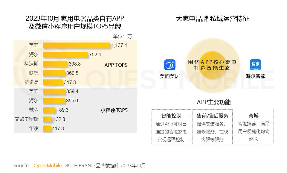 在智能家居集中化控制的用户需求下,家用电器品牌陆续自建综合控制平台,以串联旗下多类型的家电产品,并提供商城、售后等综合服务;QuestMobile数据显示,2023年10月,美的自有APP活跃用户规模超过千万。