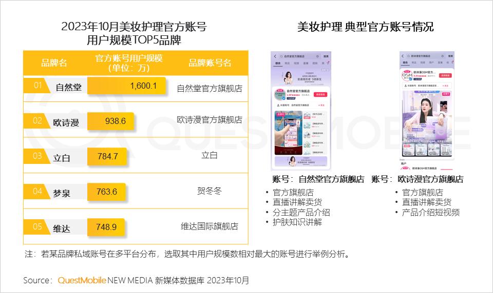 QuestMobile数据显示,2023年10月美妆护理品类中的自然堂官方账号活跃用户规模突破1,600万,高于其他品牌;自然堂的账号内容主要围绕直播卖货和产品介绍,护肤知识的讲解也成为吸引用户关注的重要内容。