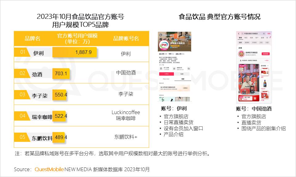 QuestMobile数据显示,2023年10月食品饮品品类中的伊利官方账号活跃用户规模近1,900万,远高于其他品牌;伊利官方账号内容具有直播卖货和产品介绍能相关内容,同时该账号设有会员入口,成为会员拉新的重要渠道。