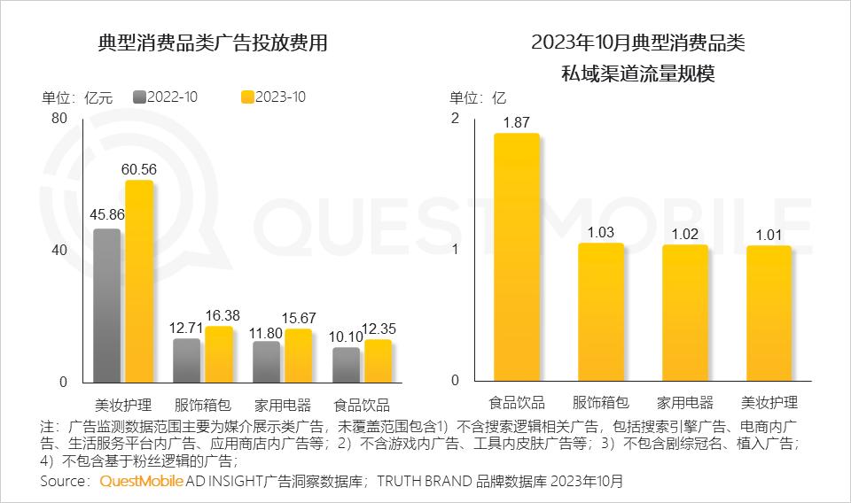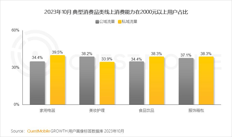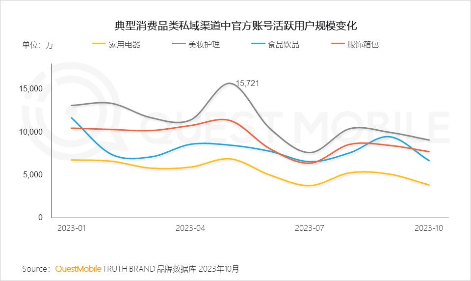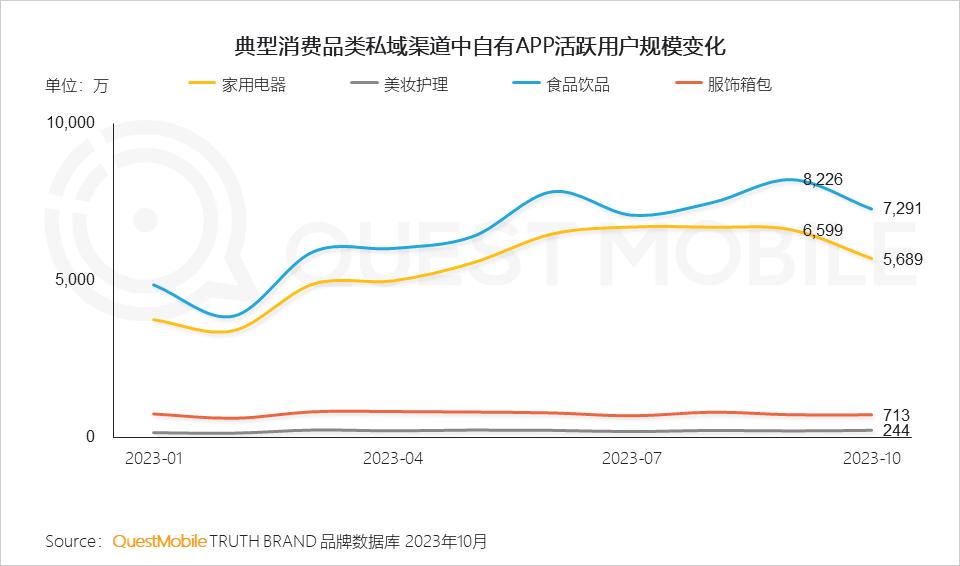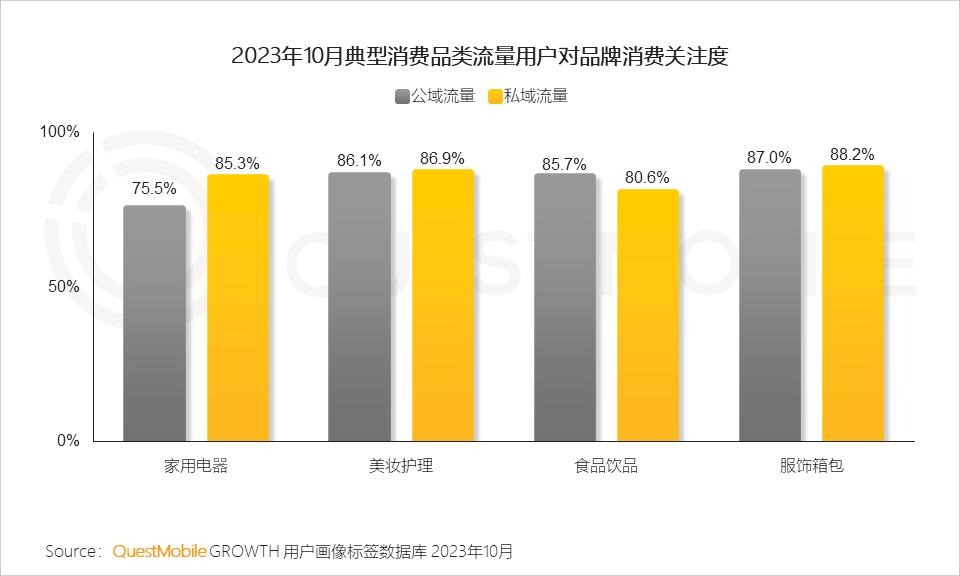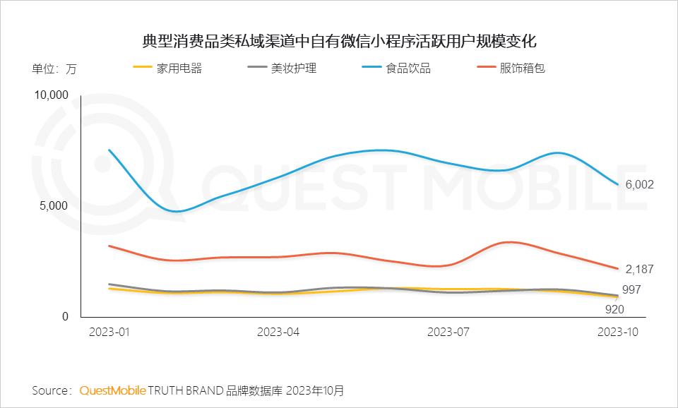 QuestMobile数据显示,食品饮品品类的私域渠道流量规模接近1.9亿,服饰箱包、美妆护理、家用电器等品类的私域渠道流量规模均过亿。