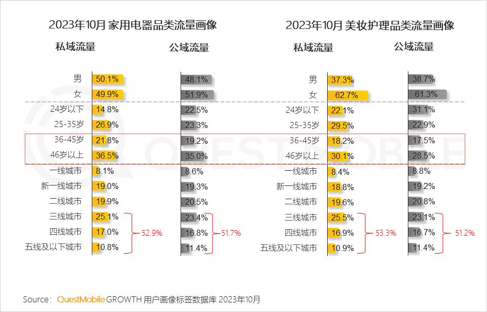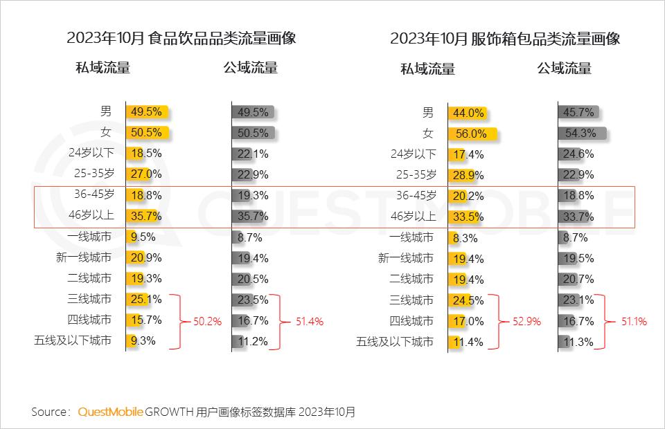 3、从流量触达的人群画像来看,私域渠道能够扩充消费品牌公域渠道的触达边界,更多的触达到中老年(36岁以上)、下沉城市(三线及以下城市)的消费用户