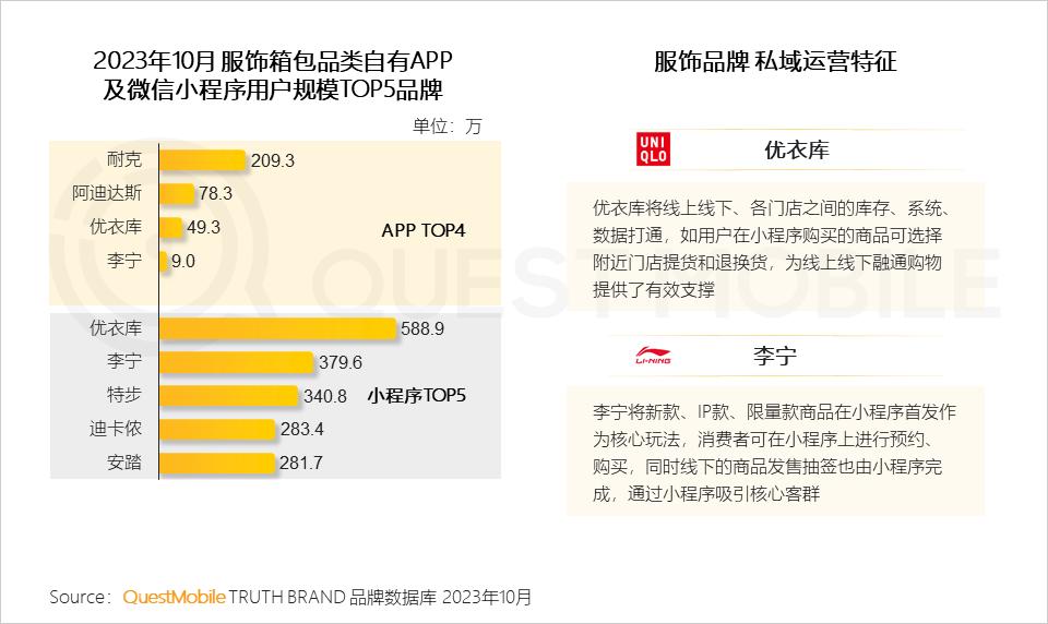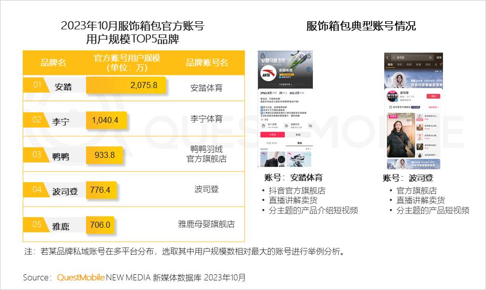 QuestMobile数据显示,2023年10月安踏官方账号活跃用户规模突破2,000万,高于服饰箱包中的其他品牌;安踏官方账号安踏体育中主要为直播卖货和产品介绍能等相关内容。