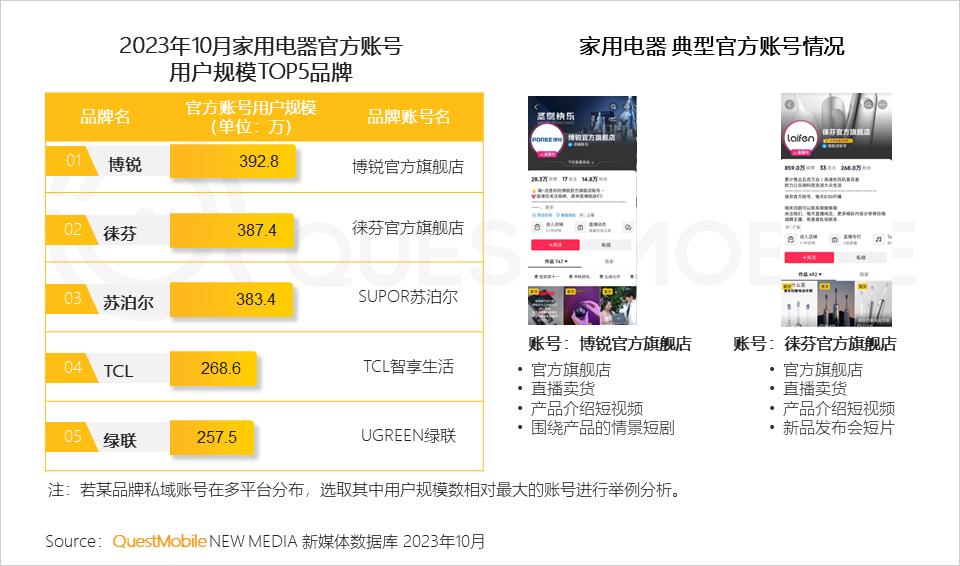QuestMobile数据显示,2023年10月家用电器品类中的博锐官方账号活跃用户规模最高,接近400万;博锐官方旗舰店内容多为直播卖货和产品介绍,同时以情景短剧的形式进行产品曝光。