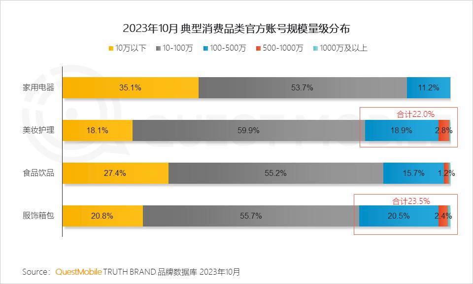 3、美妆护理、服饰箱包品类的头部账号建立已初见成效,百万级以上的官方账号占比均超过2成