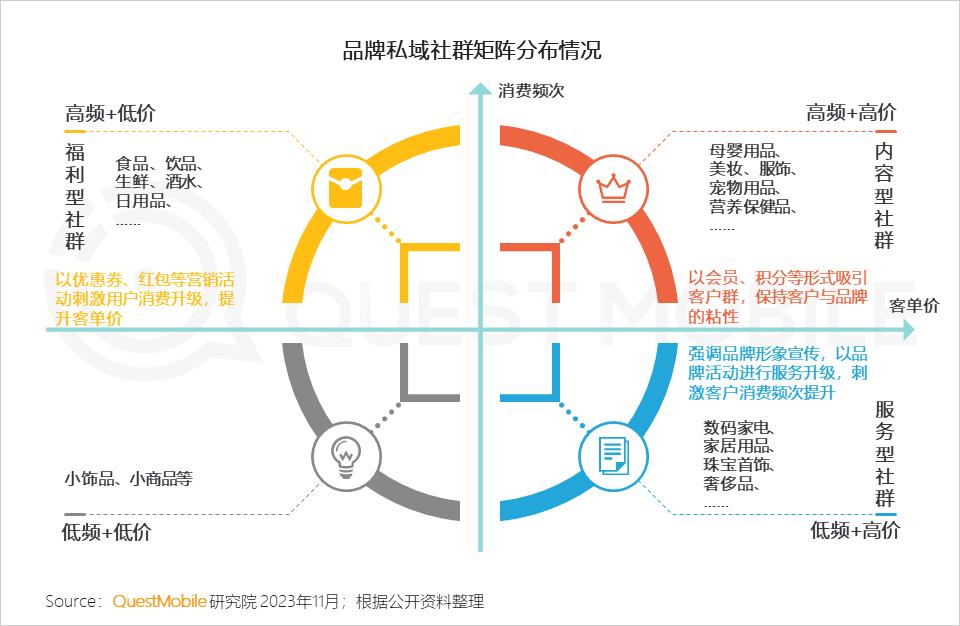 2、针对于不同消费品类,私域社群具有不同的特征,高频低价的福利型社群以优惠券、红包刺激用户消费;高频高价的内容型社群注重以会员绑定用户;低频高价的服务型社群多以品牌活动刺激用户的消费频次
