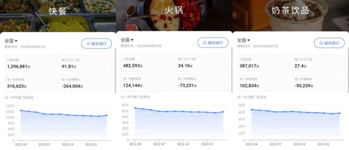 1、茶饮、火锅、快餐等多个热门品类门店数量呈现“负增长”,其中,快餐门店一年内减少26万+。