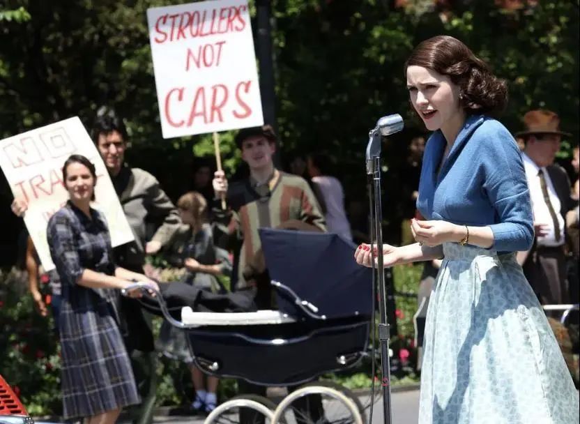 美剧《了不起的麦瑟尔夫人》中,有这样一幕:女主角米琪穿过华盛顿广场公园时,遇到一场游行,成群女性高举牌子激动地喊着:“拯救我们的广场”、“要公园,不要公路”。与此同时,一位戴眼镜的女性正在另一头发表演说,庆祝她们成功叫停了第五大道穿越中央公园的项目。