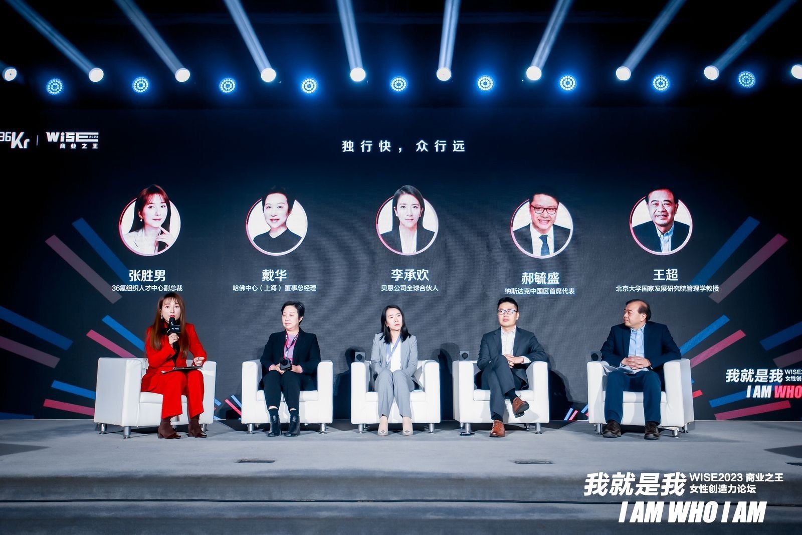 在WISE2023 商业之王大会,我就是我-女性创造力论坛中,36氪组织人才中心副总裁张胜男作为圆桌主持人,与哈佛中心(上海) 董事总经理戴华,纳斯达克中国区首席代表郝毓盛,贝恩公司全球合伙人李承欢,以及北京大学国家发展研究院管理学教授王超共同就《独行快,众行远》这一主题,进行了一场精彩的圆桌讨论。