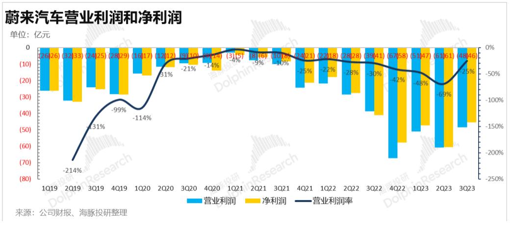 因为本季度汽车业务毛利率继续提升,再加上对经营开支上有所控制,本季度蔚来虽然仍处于深亏状态,单季度经营亏损48亿,但低于市场预期的-53亿,如果把非现金项目剔除,蔚来三季度亏损42亿,相比上季度有所改善。