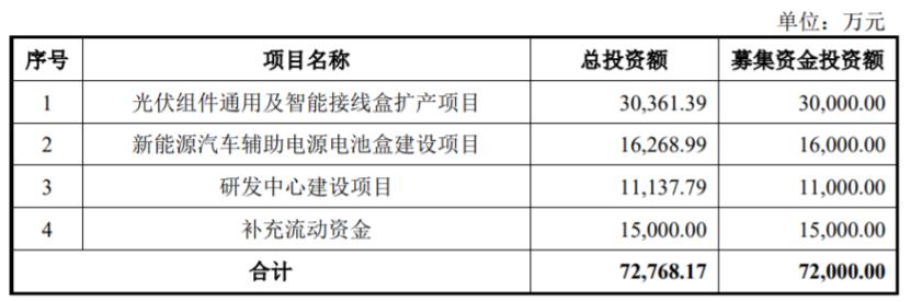 本次申请上市,公司拟募集资金约7.2亿元,用于光伏组件通用及智能接线盒扩产项目、新能源汽车辅助电源电池盒建设项目、研发中心建设项目、补充流动资金。