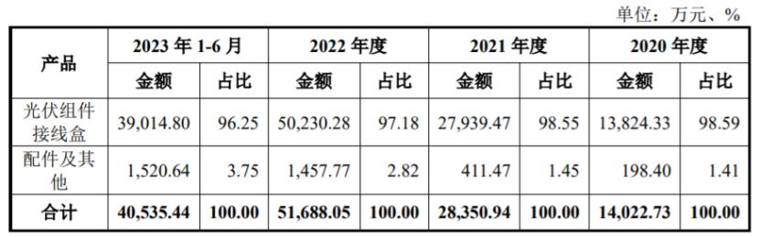 具体来看,泽润新能目前主要从事光伏组件接线盒产品的研发、生产和销售,下游市场集中在光伏行业。报告期内,光伏组件接线盒的营收占比在96%以上,产品结构较为单一。