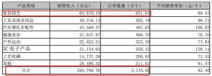在2023年上半年,易佰网络共出了3145万个订单,其中家居园艺产品的订单量最高,达到了651万单,销售额为6.49亿元 ,其次为工业及商业用品、汽摩配件、健康美容、户外运动、3C电子等。