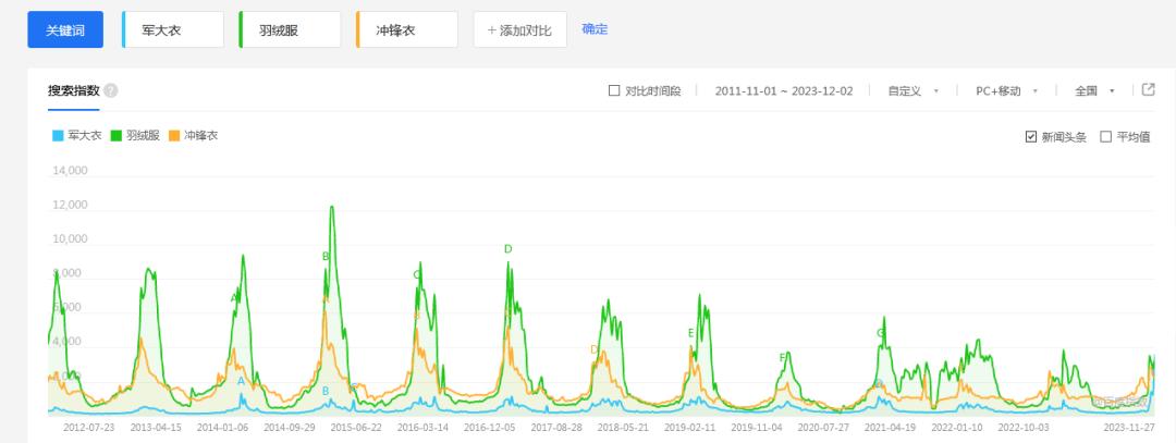 我们可以看出,羽绒服、冲锋衣在每个冬季都会成为热门话题。