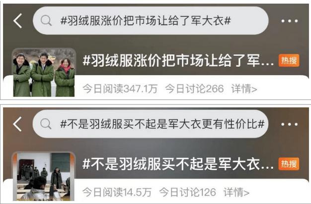 “军大衣平替羽绒服”、“军大衣走进校园”等热词霸占了好几天的百度热搜和抖音热榜。