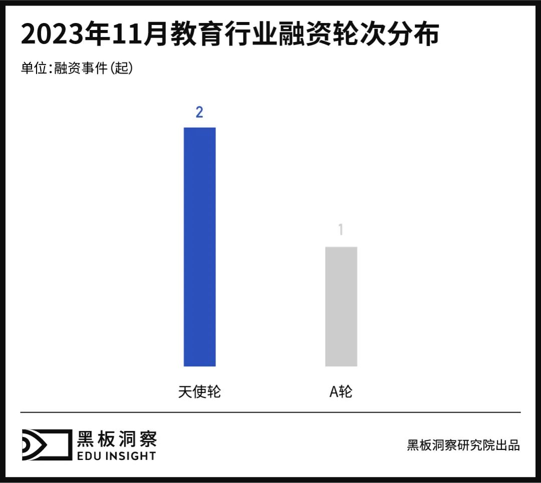 从数据来看,11 月融资轮次中,天使轮融资事件最多,为 2 起,占比 66.67%。2 家企业分别为双创教育服务商「中寰博创」和 AI 培训和咨询服务商「小智未来」。A 轮融资发生 1 起,为「羊驼教育」获得的 A 轮融资。11 月融资轮次中,均为早期融资。