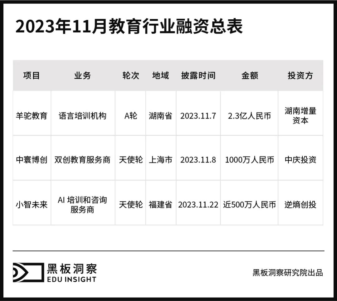 总体而言,11 月融资数量为近年来较低水平,仅发生三起融资事件。但从融资总额上看,已连续三月呈上升趋势,且远超今年前十月平均水平。除此之外,我们看到在双创领域、AI 培训领域中,教育行业仍具备增长空间以及资方青睐焦点。