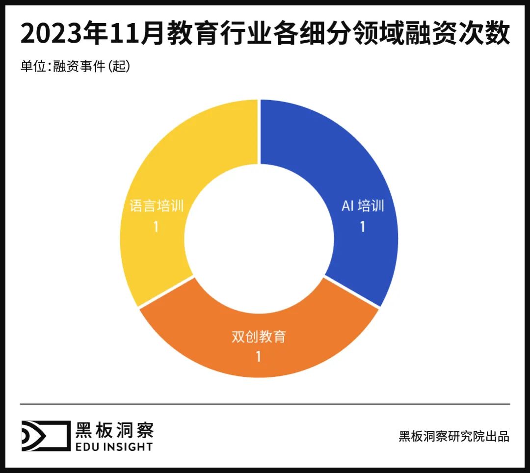 11 月融资事件细分领域中,语言培训、双创教育、AI 培训各发生一起融资事件。