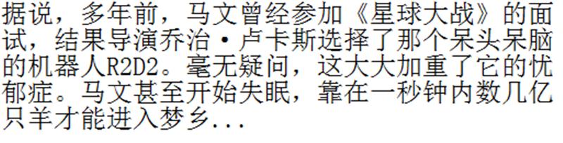 西方科幻作品也有话唠传统,不过角色身份往往是机器人。毕竟在科幻作品里无法塞个矮人进去,而要设定不会冒犯任何种族又能合理发病的话唠精神病,机器人无疑是最好的选择。像科幻小说《银河系漫游指南》中的马文可谓机器人发疯文学与英式幽灵的完美结合体。