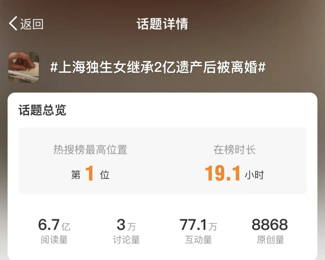 截止目前,#上海独生女继承2亿遗产后被离婚#的热搜词条就已达到6.7亿的阅读量,引发了3万的讨论和77.1万的惊人互动量。