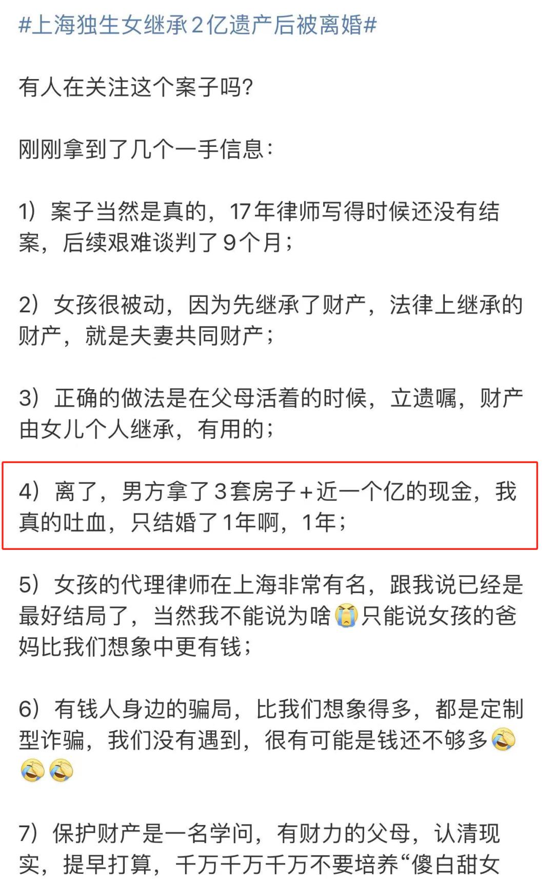 一位粉丝量达到355万的公司CEO发微博称,离婚后,男方拿了3套房子和近1亿的现金。