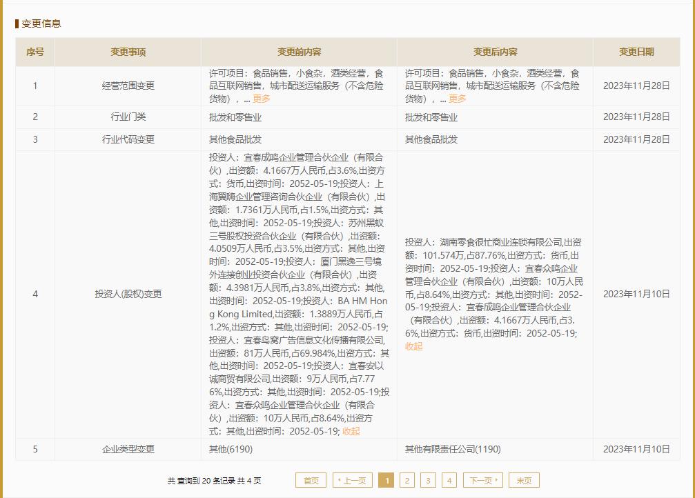 “零食很忙”成为赵一鸣零食股东,股权占比高达87.76%。赵一鸣零食创始人及高管的三家关联公司以及“翼嗨合伙企业”、“黑逸合伙企业”也同时成为“零食很忙”公司股东,合计占“零食很忙”股权总计超过35%,赵一鸣零食公司的创始人赵定、王平安亦于同日出任“零食很忙”公司董事。