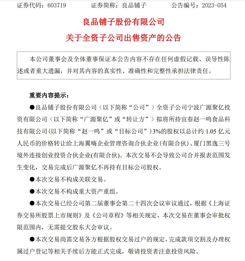 10月16日晚间,良品铺子发公告称,“广源聚亿”(良品铺子全资子公司)将所持赵一鸣零食公司3%股权转让给黑蚁资本名下的两家机构。“广源聚亿”(良品铺子全资子公司)于2023年10月19日收到所有股权转让款。