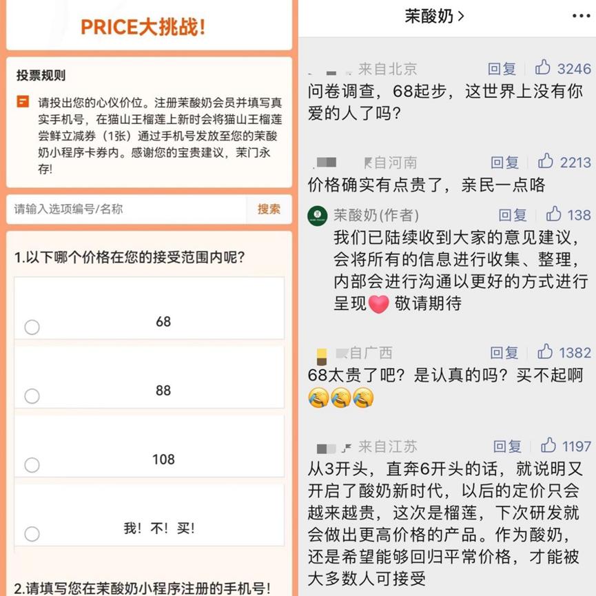 今天夏天,网红酸奶品牌茉酸奶一度成为众矢之的。事情起源于7月7日,其微信公众号发布了一篇关于榴莲奶昔定价的问卷调查,将猫山王榴莲饮品的定价设为68元、88元、108元三个等级供消费者挑选,不曾想遭到网友群起而攻之。