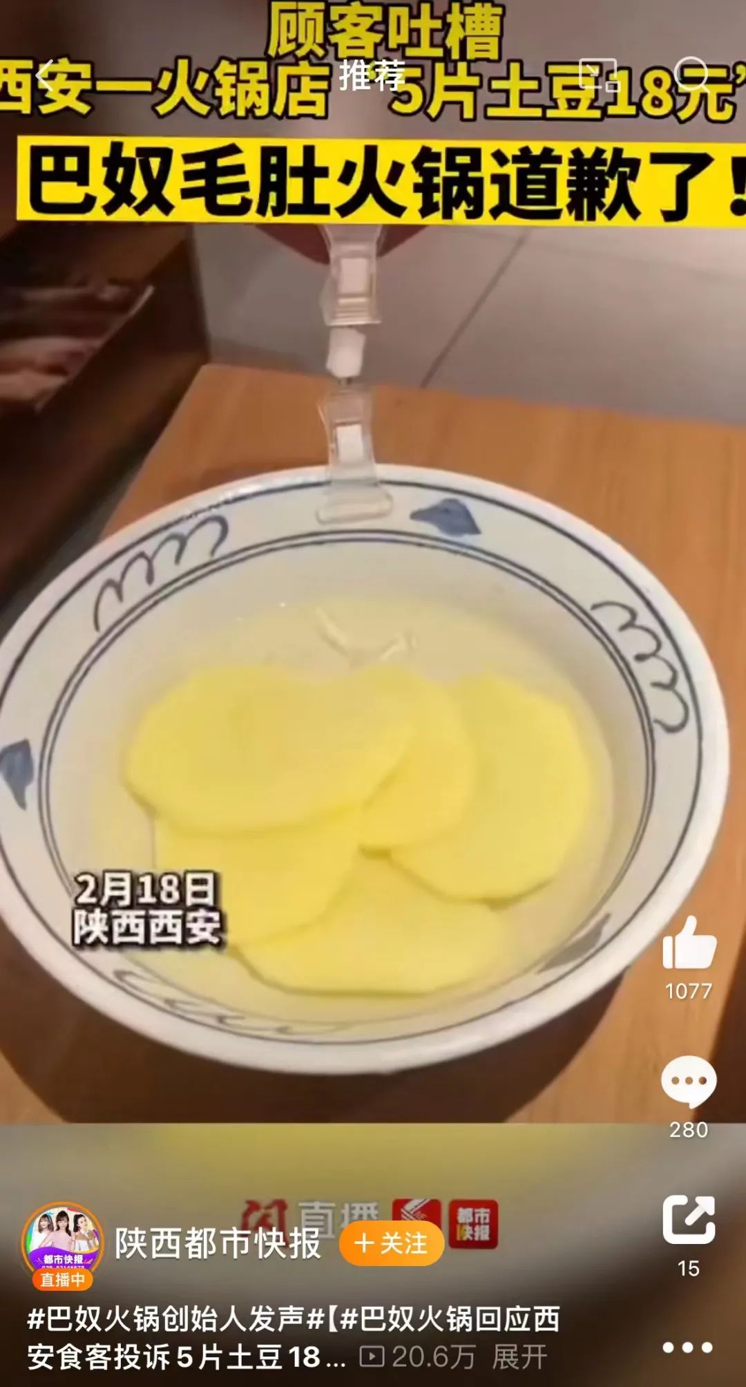 今年2月18日,陕西西安一顾客在微博发布视频吐槽,自己在巴奴毛肚火锅店花18元点了一盘土豆,端上来时只有一个小碗、5片薄片,而店家的解释是,这不是一般的土豆而是富硒土豆。“火锅店18元一份土豆仅5薄片”话题因此冲上热搜。