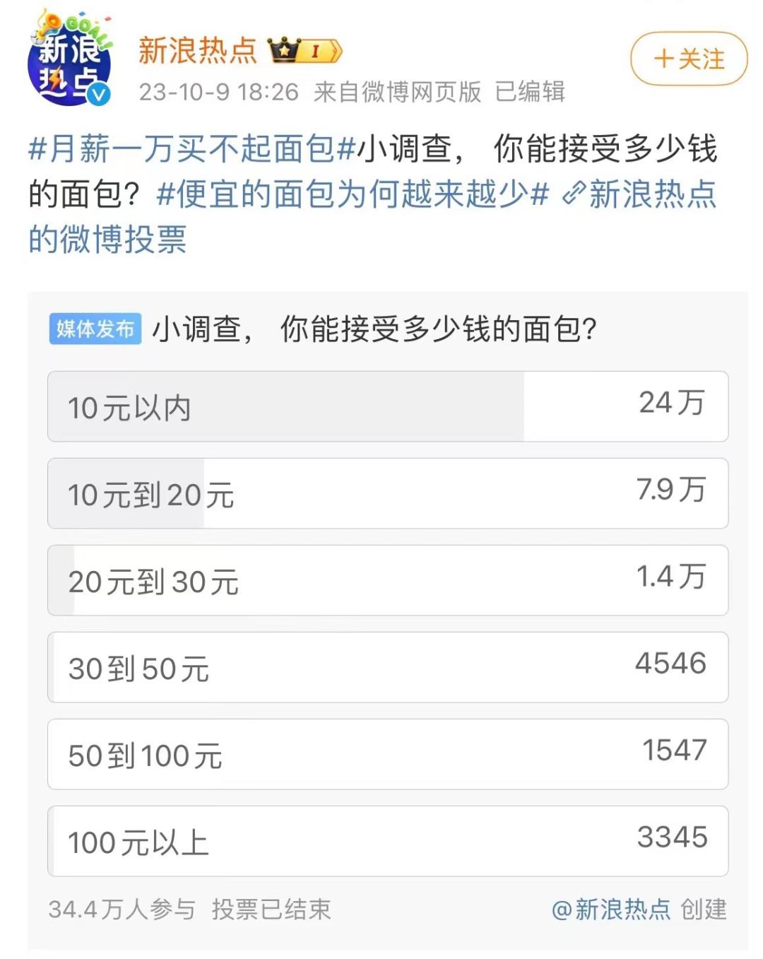 不久前 ,新浪热点在微博上发起了一项“你能接受多少钱的面包”调查,截至10月9日,共有34.4万网友完成投票。其中,选择“10元以内”和“10元到20元”的网友共占比超九成。也就是说,绝大部分网友能接受的面包价格在20元以内。
