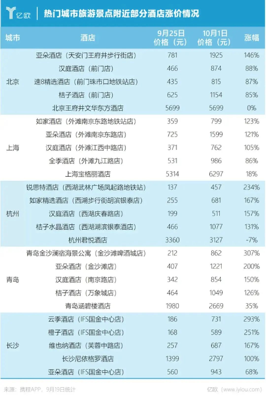 从年初起,酒店的价格便水涨船高。五一期间,不少酒店价格均较平日高出2-3倍,一些热门景点的甚至涨幅超过5倍,高达8-10倍;暑期游的火热让酒店价格再一次冲上峰值,一线城市核心地段的汉庭、如家等连锁酒店也飙到千元;长达8天的十一假期更是让酒店赚了个盆满钵满,打工人向往旅行的心则被狠狠刺痛。