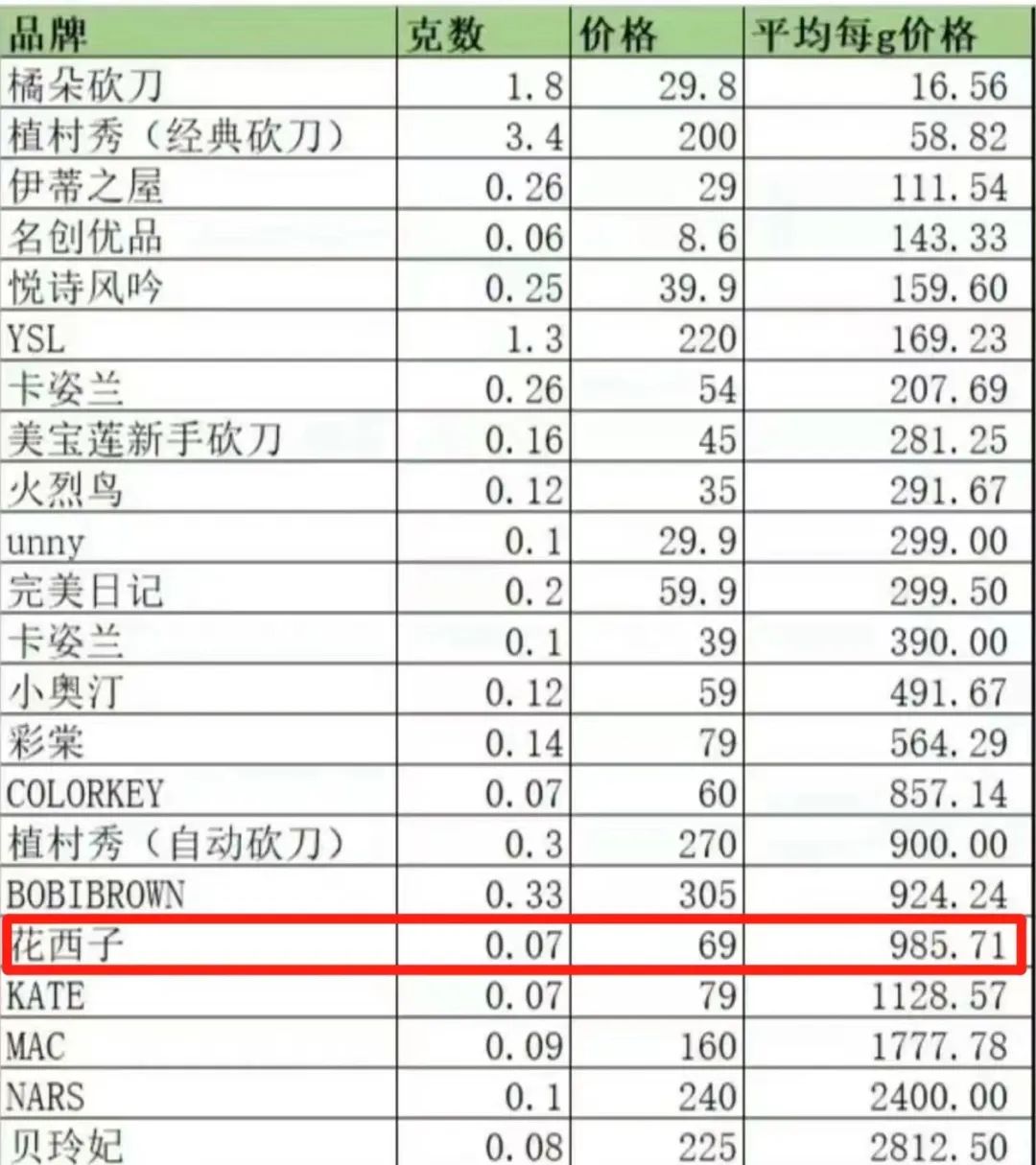 这样的言论自然踩到了网友们的雷点,李佳琦和花西子都被送上风口浪尖。网友们不仅质疑李佳琦,更全力寻找花西子价贵的证据。据网友统计,净含量0.07g的花西子某款眉笔官方售价69元/支,算下来每克售价高达985.71元几乎可以买到2克黄金了。